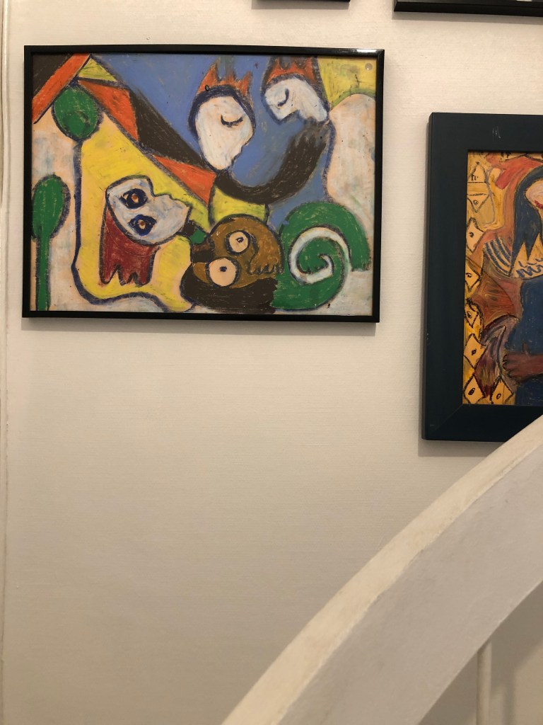 Elle est assise à son bureau, moi en face d’elle, tout près. Tellement près que je peux presque lire ce qu’elle écrit quand je parle. Je lui demande pourquoi elle prend des notes, elle me répond « pour me souvenir ». Tiens donc. Le long du mur il y a un divan qui m’intrigue pas mal. Qu’est ce que ça peut bien changer de parler allongée ? Elle me dit que dans cette position ce sont d’autres mots qui sortent, aussi parce qu’on ne voit pas le docteur qui est derrière soi. Ça me plairait pas je crois. Sur ma droite il y a une grande bibliothèque. Avec des livres que je vois aussi chez moi, je reconnais les noms : Freud, Dolto, Klein… sauf qu’ici ils sont derrière une vitrine. Ça donne encore plus envie de les toucher. J’aime bien les regarder quand j’ai pas envie de parler. Les livres d’art aussi, et les petits objets nids à poussière posés un peu partout.
